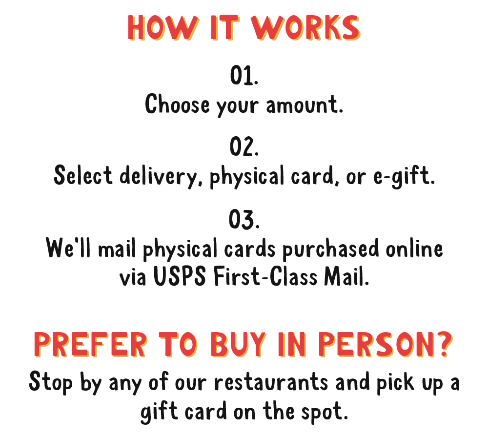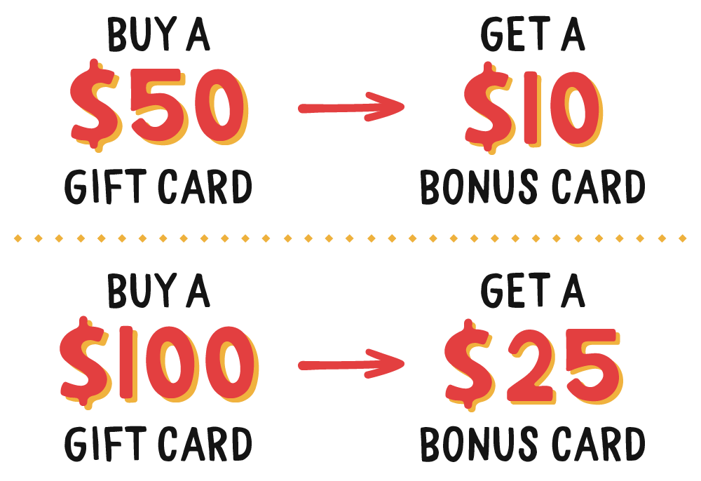 *No limit. Offer available until December 31st, 2025, on all gift card purchases made on Anna’s website and in-restaurant. Bonus promotional cards are valid from January 1, 2026, to February 28, 2026. Redeemable at any Anna’s location. One card per guest, per visit. No cash value. Cannot be combined with any other offer.